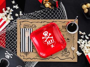 Board some desserts on these Red Pirate Dessert Plates for the birthday crew! The small square plates feature white skull and crossbones, dashed lines to the X marks the spot, and the word "ARR!" in the middle on a red background. These paper plates are perfect for serving up any small treats or goodies at your child's pirate birthday party.