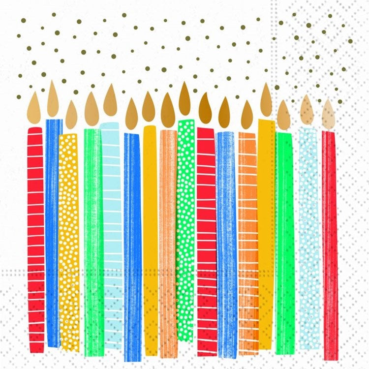 Add some color and lights to the birthday celebration with these cocktail napkins! They have lots of primary colored candles and gold foil accents to make it a blowout celebration.