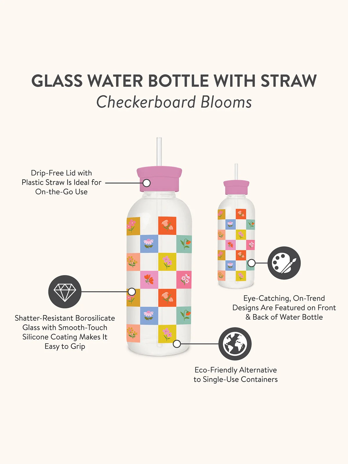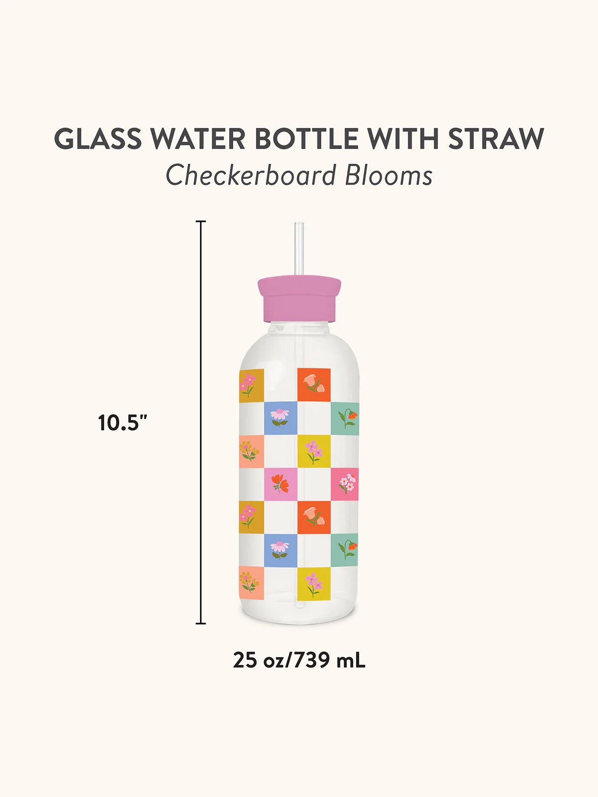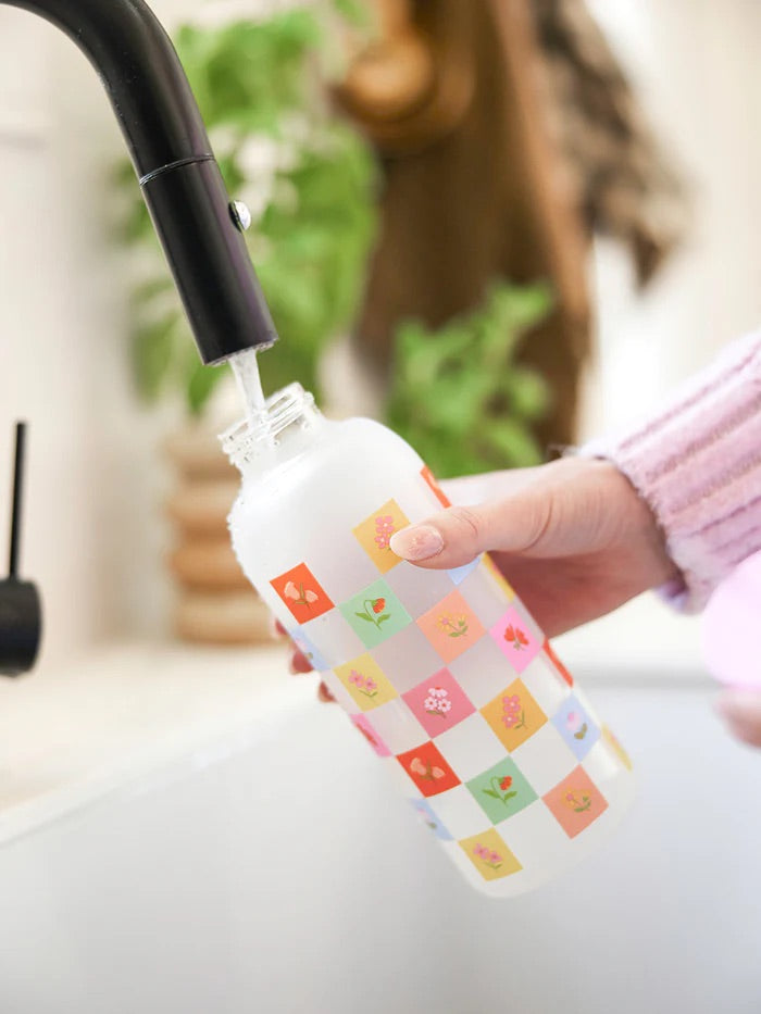 BLOOMING CHECKERBOARD: GLASS WATER BOTTLE WITH STRAW