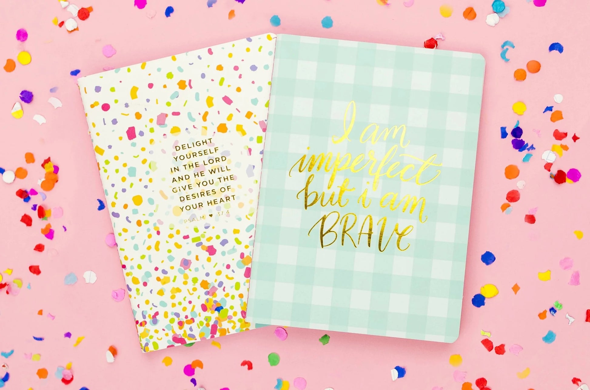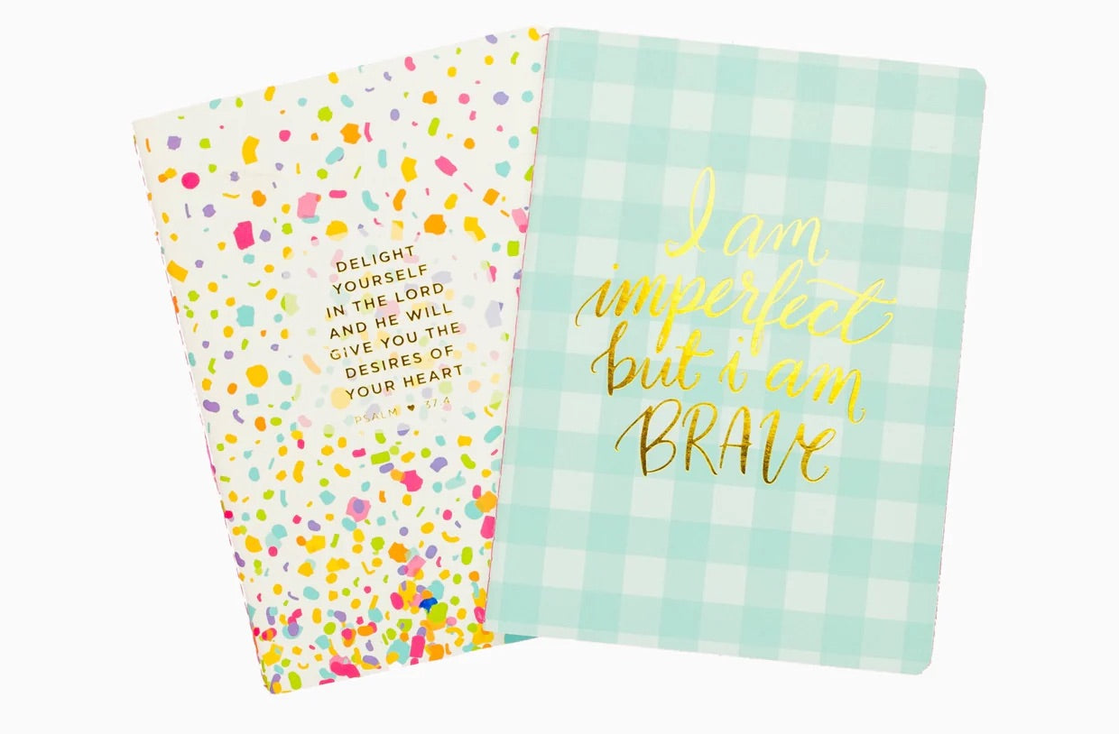 This vibrant notebook set makes an ideal gift for either prayer journals or as a thoughtful present. The set includes one of each design shown, with the blue gingham notebook featuring a gold foil imprint saying "I am imperfect but I am brave," while the confetti notebook is elegantly imprinted with Psalm 37:4 - "Delight Yourself in the Lord, and He will give you the desires of your heart."