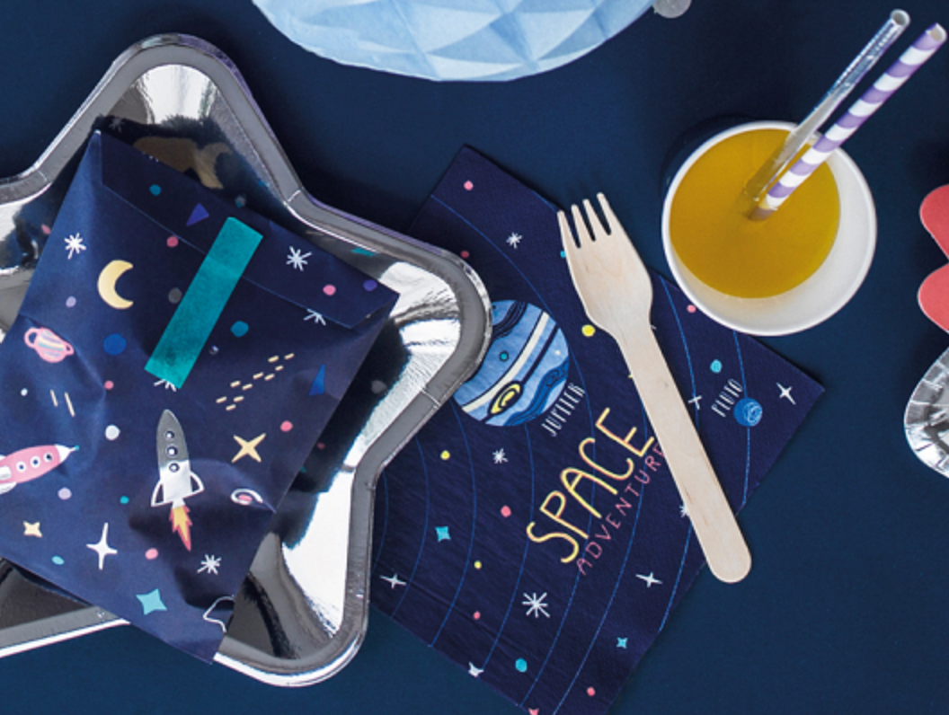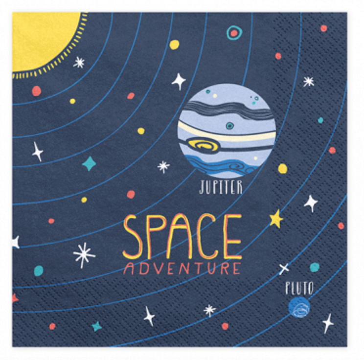 Set the table with these Space Adventure Lunch Napkins! These large paper napkins feature an illustrated solar system design of our planets and stars with the bright yellow sun in the center. When folded, the navy blue square paper napkins feature the headline "Space Adventure" printed in yellow text. Your little astronauts will love using these space napkins!